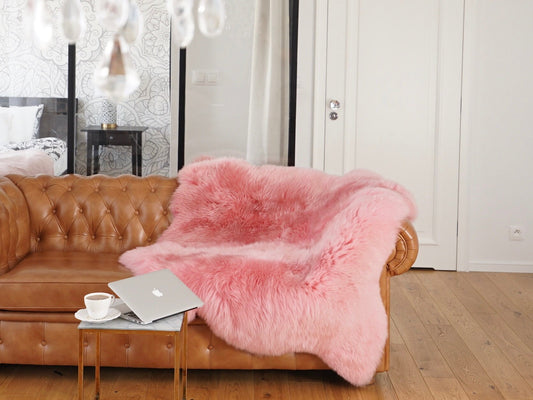 GIANT SHEEPSKIN Double XXL Pink Throw Genuine leather Sheep Skin 79" x 30" Decorative rug Natural comfy, cozy, hair is very thick, shiny !