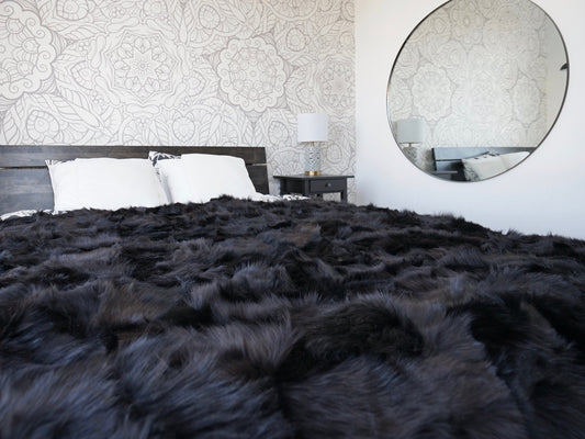 Genuine Toscana Lamb Sheepskin Throw Blanket Rug Black Bed Spread Sofa Throw Gray Rug Black Rug Large Rug