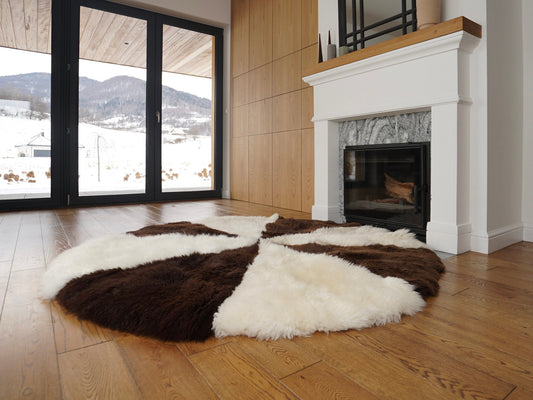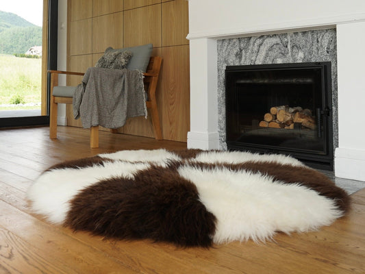 GIANT SHEEPSKIN Round White and Brown Throw Genuine leather Sheep Skin 74" Decorative Amazing Natural Round Sheepskin Rug - Thick Creamy